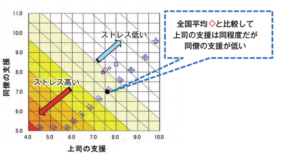 ただし、仕事のストレス判定図は4つの項目のみから評価を行っている点に注意が必要です。従業員がメンタル不調に陥る原因は4つの項目以外にも職場の対人関係など、さまざまです。集団分析の結果を見るときには職場の対人関係など他の各因子の結果もあわせて確認することがのぞましいです。