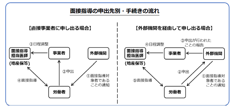 直接事業者に申し出る場合と、外部委託先に申し出る場合の2つが明示されました。医師面接を申し出る者の割合が少ないことから、外部委託先に申し出る場合の流れが具体的に示されました。