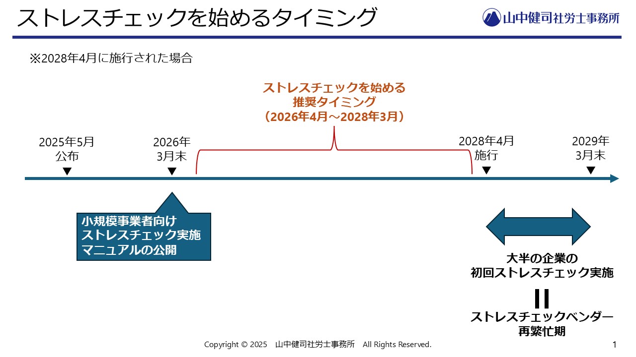 2025年に可決された労働安全衛生法改正により、50人未満を含むすべての事業場にストレスチェックを実施することが義務付けられました。ストレスチェック部分の施行時期はまだ正式に発表されていませんが、おそらく2028年の4月頃と予想されています。仮に2028年4月に施行された場合、現在ストレスチェックを実施していない50人未満の事業場は、2028年4月~2029年3月までの間に初回のストレスチェックを実施しなければなりません。