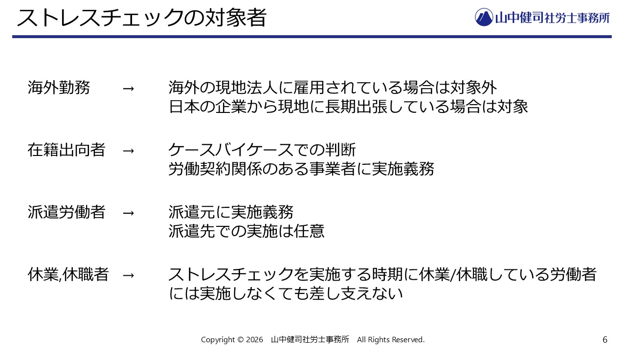 - 海外勤務の従業員については、海外の現地法人に雇用されている場合は対象外ですが、日本の企業からの長期出張者の場合は対象に含める必要があります。