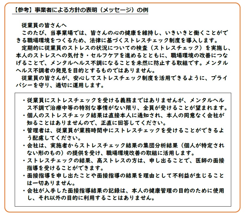 事業者は、ストレスチェック制度の実施責任者として、制度の導入方針を表明することとなっています。ここで重要なのは、とくに労働者に安心して活用してもらえるようにメッセージを出すことです。たとえば以下のメッセージの例では、ストレスチェック制度を導入すること、メンタルヘルスの未然防止が目的であること、プライバシーは守られることといった点が示されています。