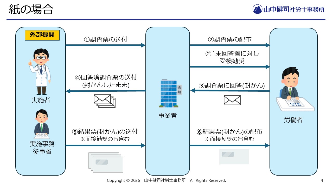 紙の場合、どうしても調査票の回収や結果票の配布に事業者が入ってきますが、個人の回答内容や結果は会社の担当者に見られないように配慮されていることが一般的です。このような仕組みになっていない場合は注意が必要です。