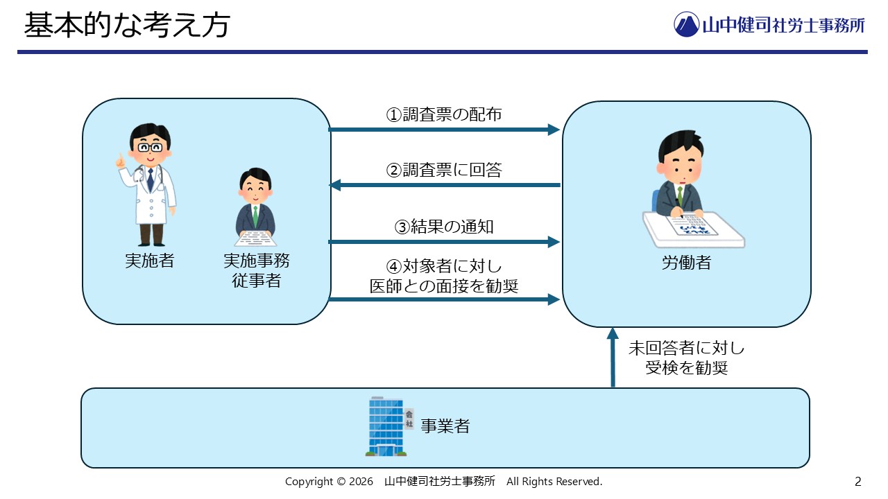 - 事業者は労働者に調査票を配布します。事業者は労働者の提出状況を確認し、調査票に回答していない労働者には適宜回答を促します。