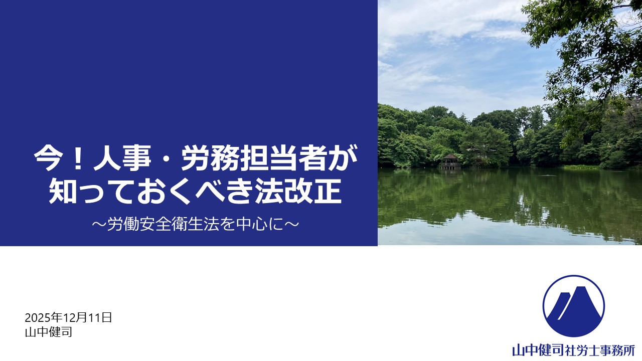 前半は2026年~2028年にかけて予定されている労働法・社会保険関係の法改正の概要について、後半はストレスチェックの義務化拡大と企業の対応について解説いたしました。50名を超える参加者の方にご参加頂きました。
